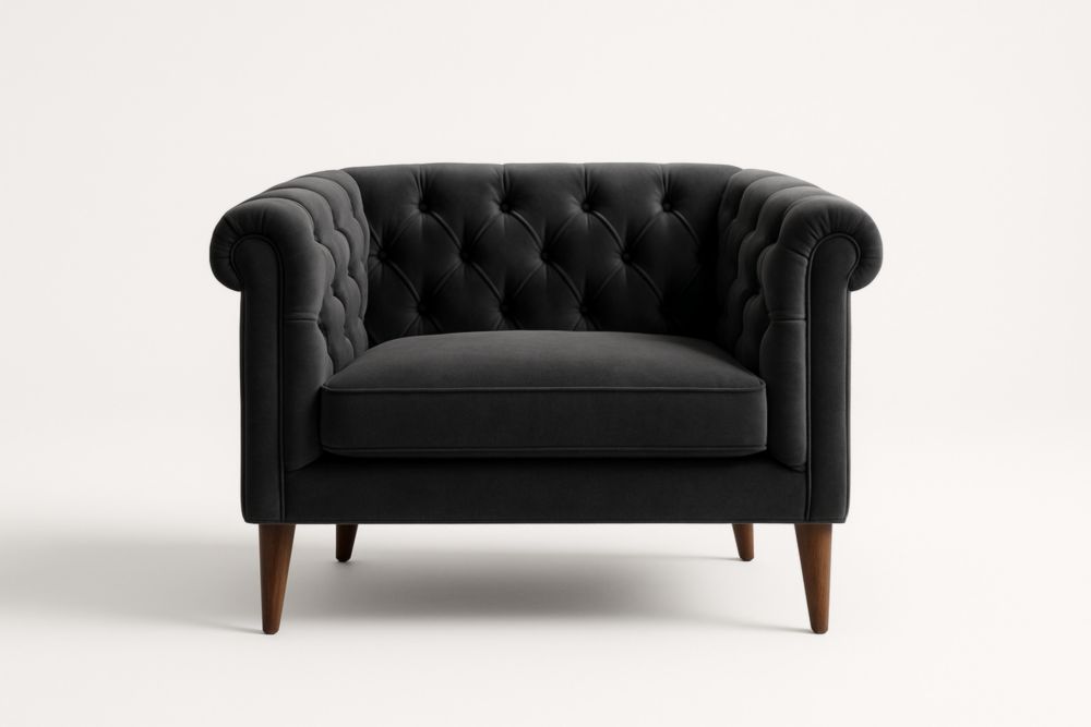 Poltrona da soggiorno Chesterfield in velluto nero con gambe in legno massello