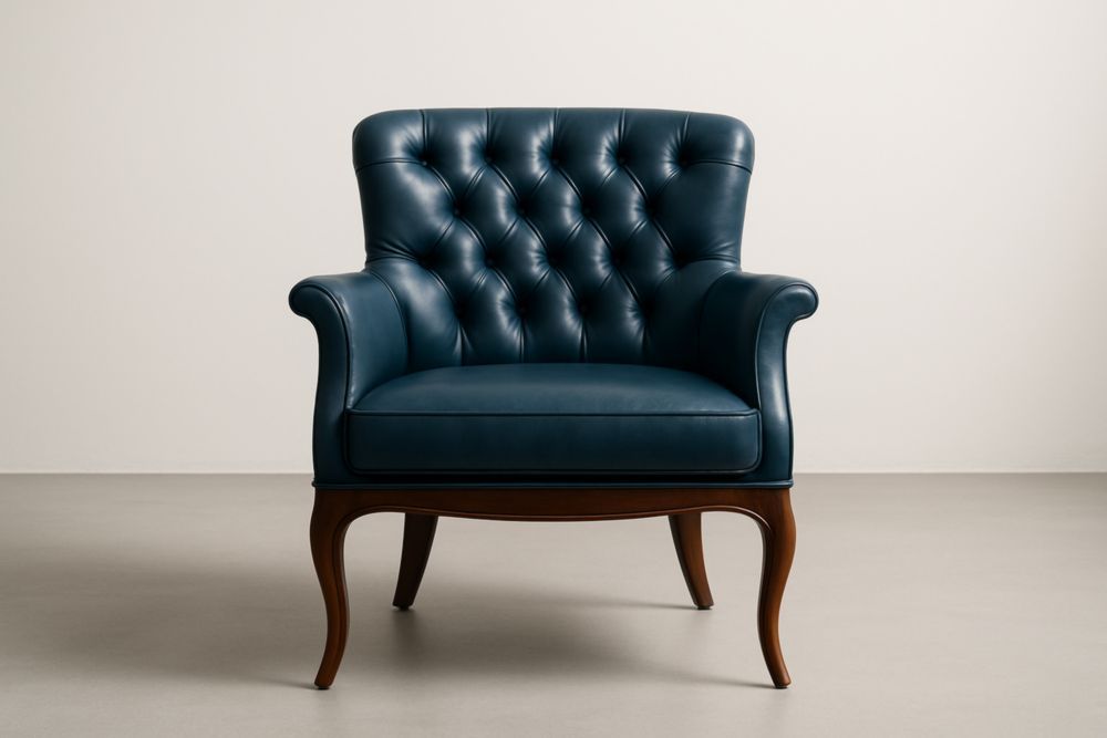 Poltrona da soggiorno in pelle blu con gambe in legno massello