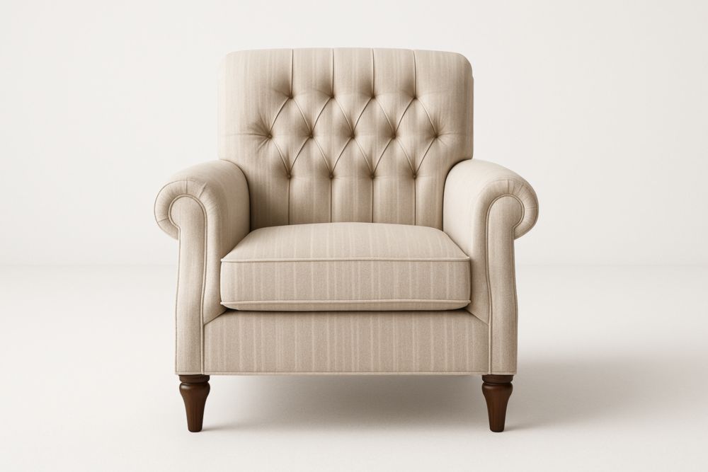 Poltrona da soggiorno in tessuto poliestere a righe beige con gambe in legno di faggio